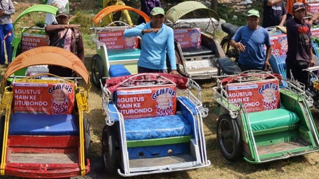 “Penumpang sering bertanya soal poster di becak saya. Dari situ saya jelaskan sedikit yang saya tahu,” kata seorang pengemudi becak di kawasan Alun-Alun Situbondo.