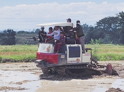 Ia bahkan mengajak mereka naik alat dan mesin pertanian (alsintan) untuk melihat langsung sekaligus mencoba cara pengoperasiannya.