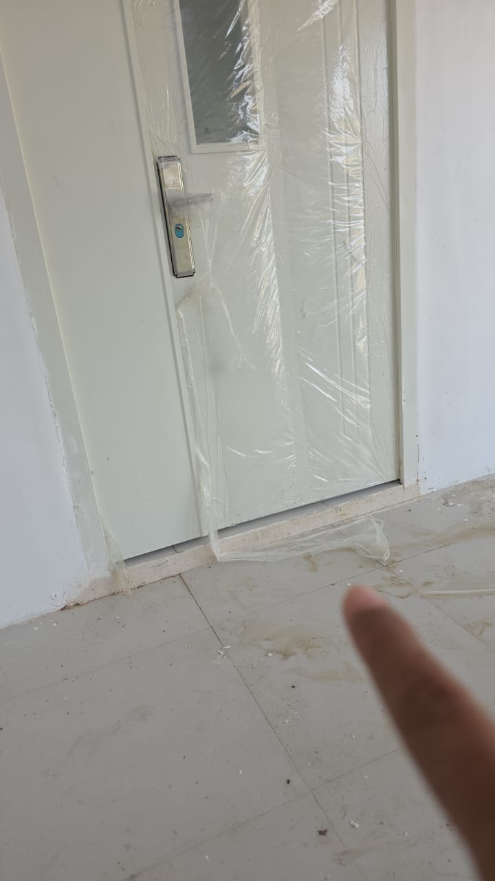 Pintu dan kusen masih dalam kondisi terbungkus plastik, menandakan pekerjaan belum tuntas secara menyeluruh.