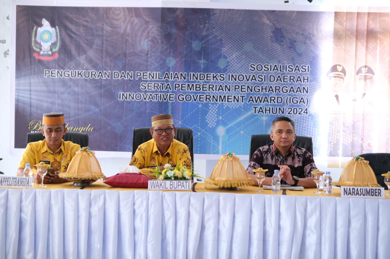 SOPPENG – Wakil Bupati Soppeng Ir H. Lutfi Halide. MP membuka sosialisasi Pengukuran dan Penilaian Indeks Inovasi Daerah serta pemberian Penghargaan Innovative Goverment Award (IGA) Tahun 2024, diruang Rapat Kantor Gabungan Dinas Kabupaten Soppeng, Kamis (4/7/2024).