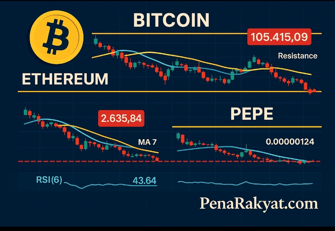 Harga BTC saat ini bergerak di antara rata-rata pergerakan MA 7 dan MA 30, menandakan fase konsolidasi yang biasanya menjadi fase sebelum lonjakan besar. Pola segitiga simetris yang terbentuk di grafik harian memperkuat indikasi ini. Jika Bitcoin menembus resistance di 106.800 USDT dengan volume tinggi, target selanjutnya berada di area 110.000 hingga 112.000 USDT. Sebaliknya, jika support di 104.500 USDT jebol, penurunan tajam ke 101.000 atau bahkan 98.000 USDT bisa terjadi.