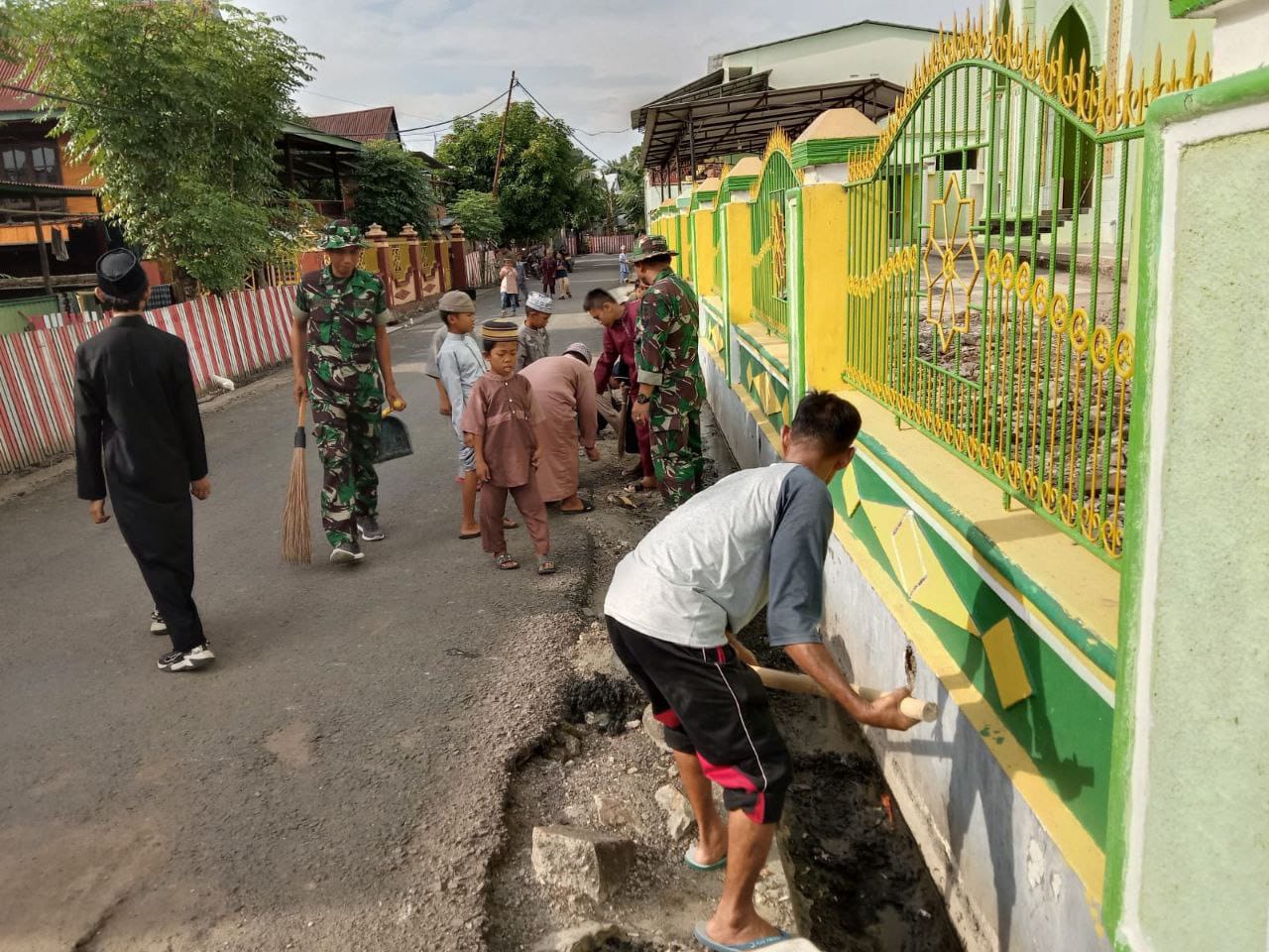 Aksi Bersih bersih Koramil 01/Panca Lautang bersama para guru dan Siswa dimasjid Nurul Falaq