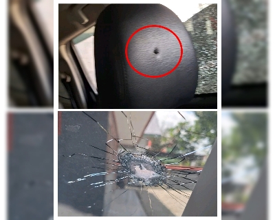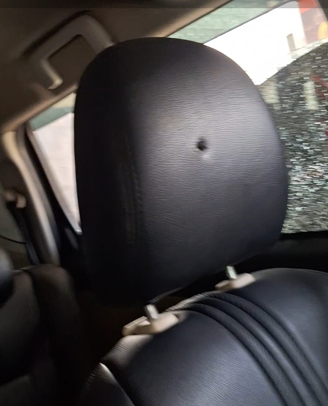 Lubang tembus tampak jelas di kaca depan bagian kanan, sejajar dengan posisi kepala pengemudi. Bekas tembakan juga terlihat di sandaran kepala kursi sopir dan kursi penumpang depan, menunjukkan arah tembakan yang nyaris fatal.