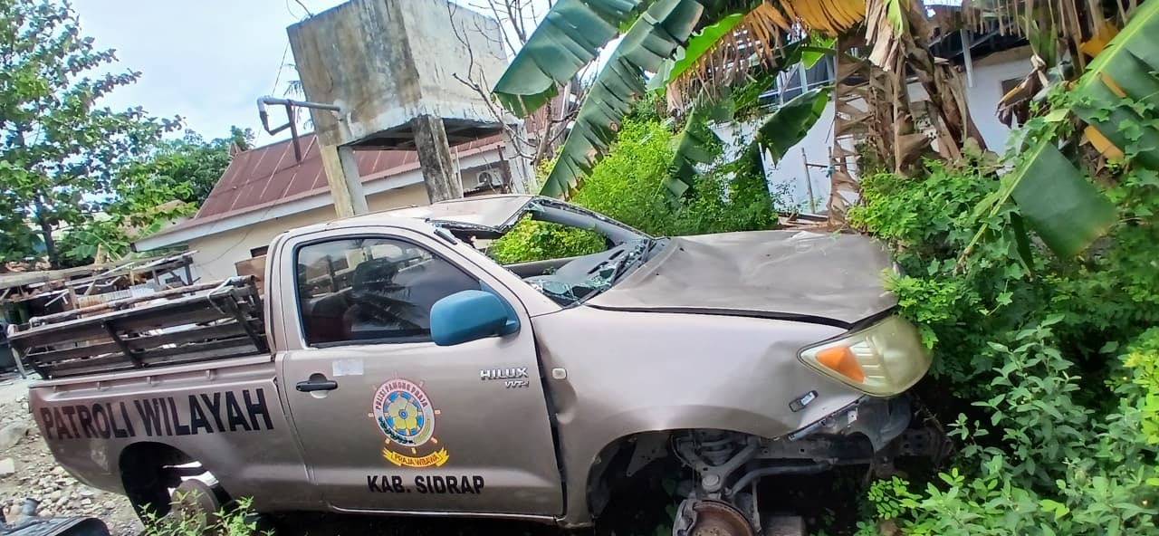 Foto-foto kerusakan mobil itu beredar luas dan diterima redaksi. Kendaraan berwarna cokelat tersebut masih jelas menampilkan logo Satpol PP di bagian pintu dengan tulisan Kabupaten Sidrap.