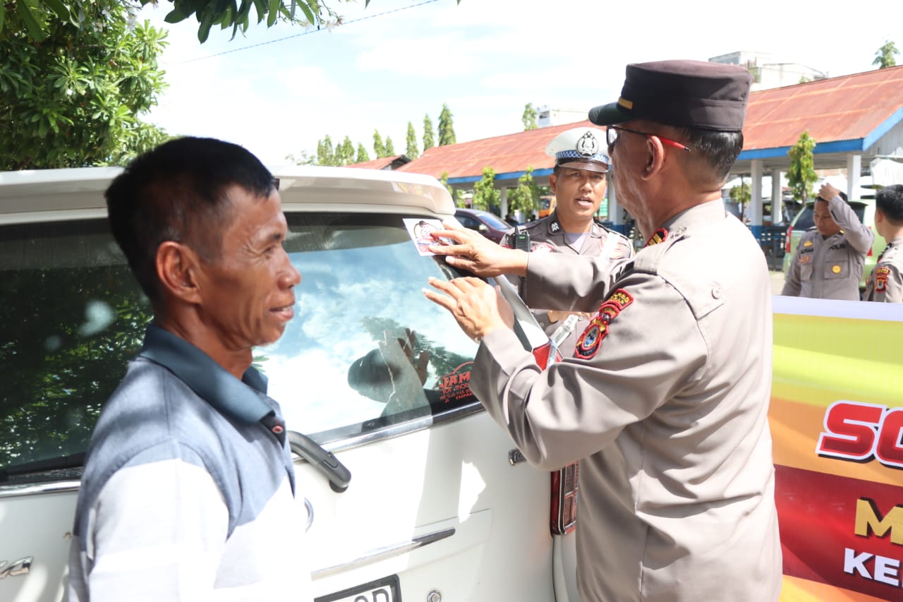 Selain penyuluhan, petugas juga melakukan pemasangan sticker pada kendaraan umum dan pribadi. Stiker tersebut berisi himbauan “Mudik Aman, Keluarga Nyaman” dan Hotline 110 yang bisa dihubungi saat terjadi kendala di perjalanan.