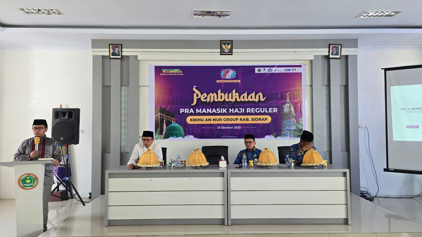 SIDRAP, Penarakyat.com — Staf Ahli Kementerian Agama RI Dr. H. Bunyamin M. Yapid, Lc., M.H. menghadiri kegiatan Pra Manasik Haji Reguler Tingkat Kabupaten Sidrap yang digelar di Aula Kantor Kementerian Agama Kabupaten Sidenreng Rappang (Sidrap),Kamis (23/10/2025).