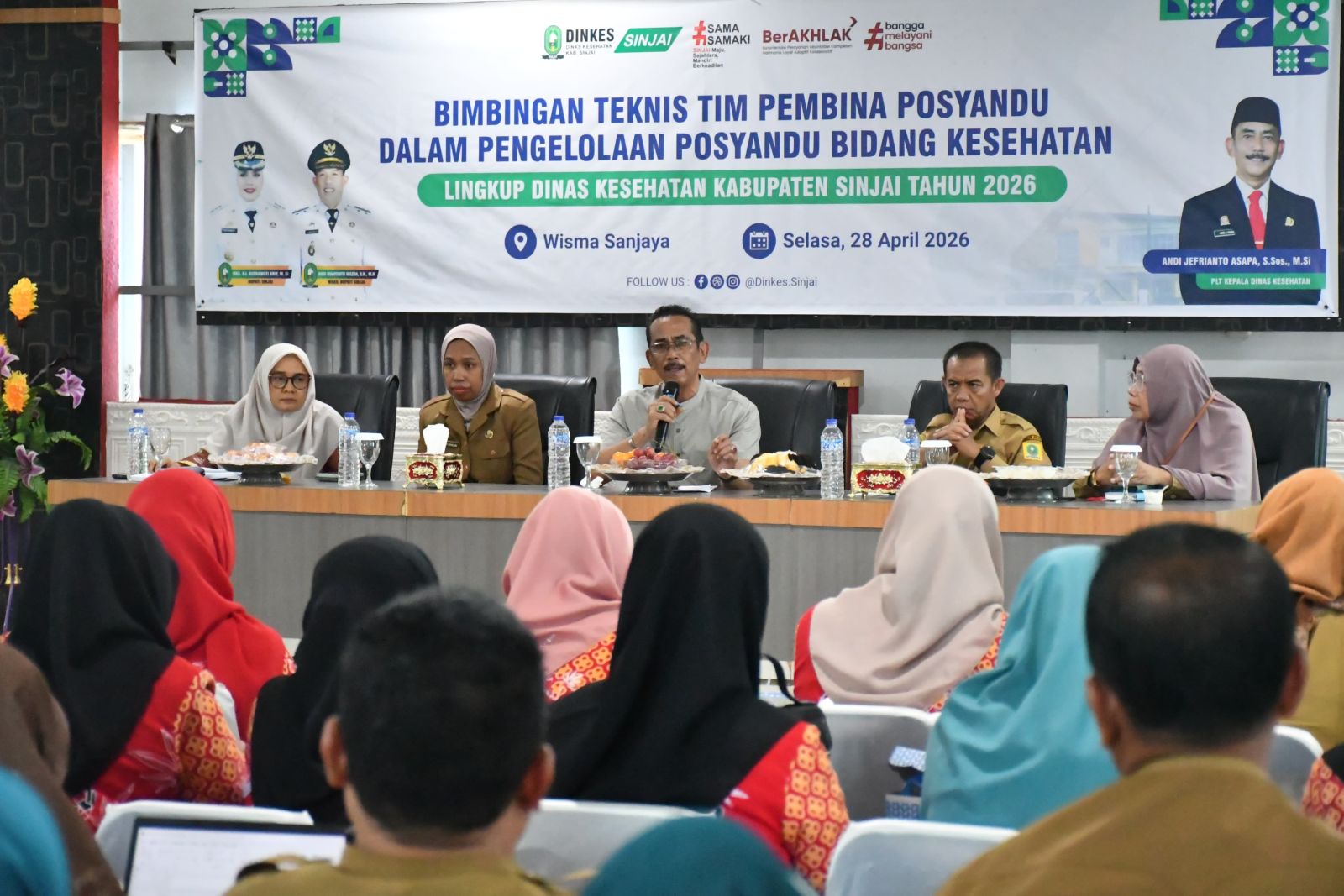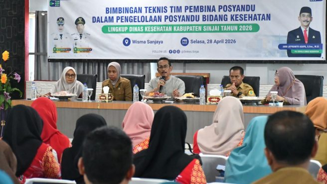 Dinas Kesehatan Kabupaten Sinjai menggelar Bimbingan Teknis (Bimtek) Tim Pembina Posyandu Dalam Pengelolaan Posyandu Bidang Kesehatan, di Aula Wisma Sanjaya, Selasa (28/4/2026).