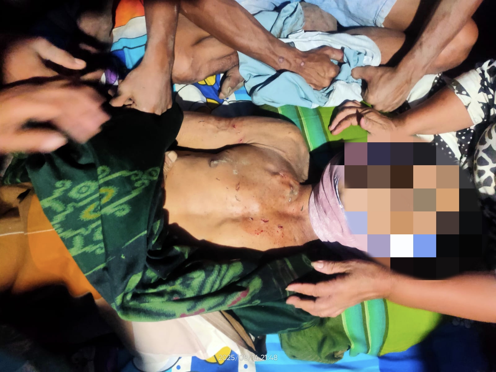 Korban mengalami luka gigitan cukup parah pada bagian leher yang menyebabkan robekan terbuka. Selain itu, terdapat sejumlah luka bekas gigitan dan cakaran di bagian dada dan bahu, yang diduga akibat serangan buaya saat korban berusaha melepaskan diri
