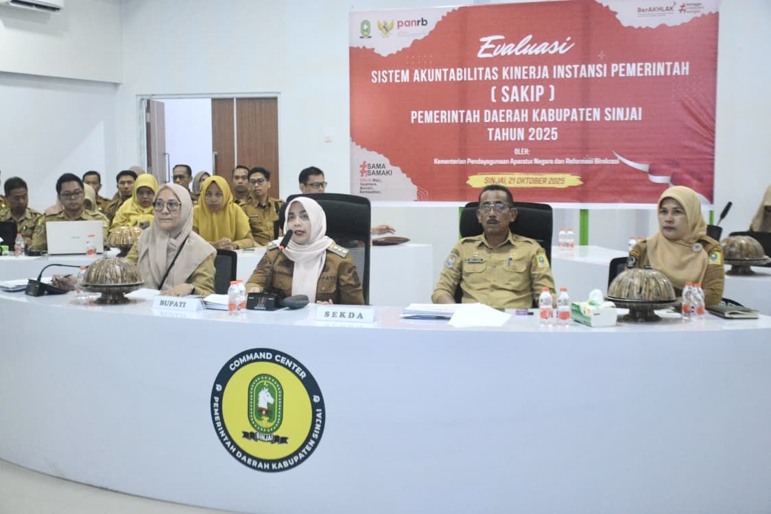 SINJAI, Penarakyat.com – Pemerintah Kabupaten Sinjai kembali mengikuti evaluasi Sistem Akuntabilitas Kinerja Instansi Pemerintah (SAKIP) tahun 2025 yang digelar secara virtual oleh Kementerian Pendayagunaan Aparatur Negara dan Reformasi Birokrasi (KemenPAN-RB), Selasa (21/10/2025). Evaluasi tersebut langsung diikuti oleh Bupati Sinjai, Dra. Hj. Ratnawati Arif, didampingi Sekretaris Daerah Andi Jefrianto Asapa, bertempat di Gedung Command Center Rujab Bupati Sinjai.