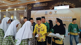 Penyerahan santunan dilakukan oleh Bupati Soppeng Suwardi Haseng usai melepas kloter pertama calon jemaah haji Soppeng di Masjid Agung Darussalam Watansoppeng, Kamis, 16 April 2026.