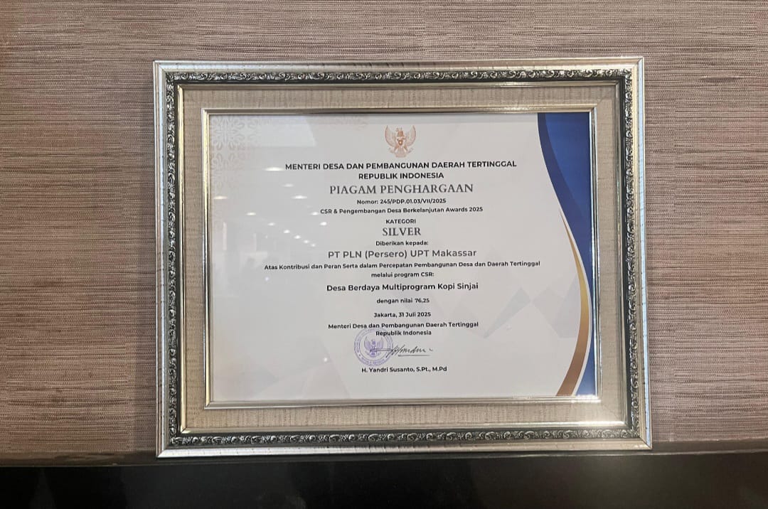 Unit Pelaksana Transmisi (UPT) Makassar berhasil meraih Silver Award pada ajang bergengsi CSR & Pengembangan Desa Berdaya (PDB) Awards 2025 yang digelar Kementerian Desa, Pembangunan Daerah Tertinggal, dan Transmigrasi (Kemendes PDTT).