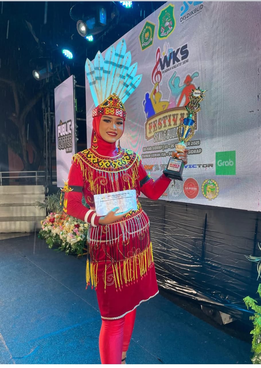 Gadis berusia 12 tahun itu kembali menorehkan prestasi membanggakan dengan meraih Juara 2 kategori remaja pada Festival Seni dan Budaya Sidrap Tingkat Pelajar 2025 yang digelar di Gelanggang Usman Isa, Kota Pangkajene, Kecamatan Maritengngae, Sabtu malam (25/10/2025).