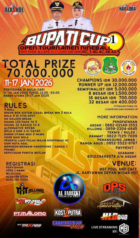 Turnamen billiard tingkat regional dan nasional ini memperebutkan total hadiah Rp70 juta dan berlangsung pada 15–17 Januari 2026 di HST Pool & Café, Jalan Ganggawa, Pangkajene Sidrap.