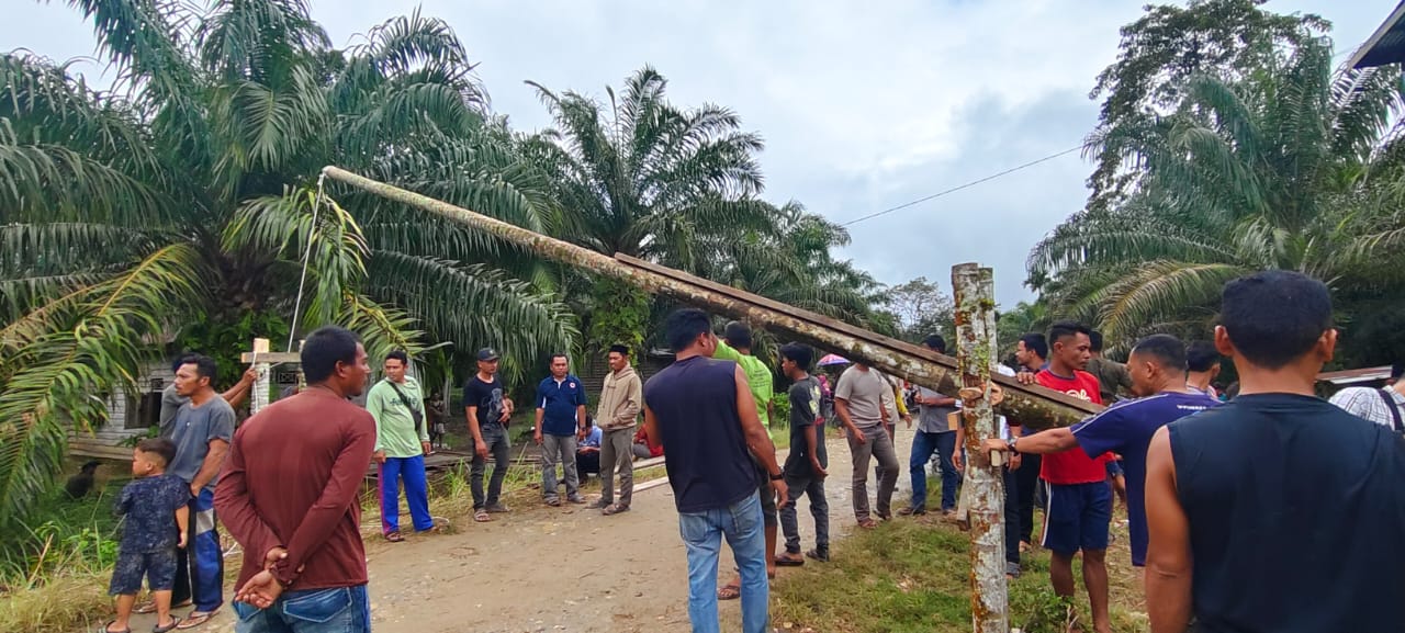 Terlihat Puluhan Warga Desa Tualang Bersama Kaum ibu ibu Berbondong-bondong Ikut Serta Bersama Para Bapak bapak mendirikan palang dan Pos Jaga di desa Tualang Jalan Lintas Utama satu satunya PT. ASN (Agro Sinergi Nusantara)