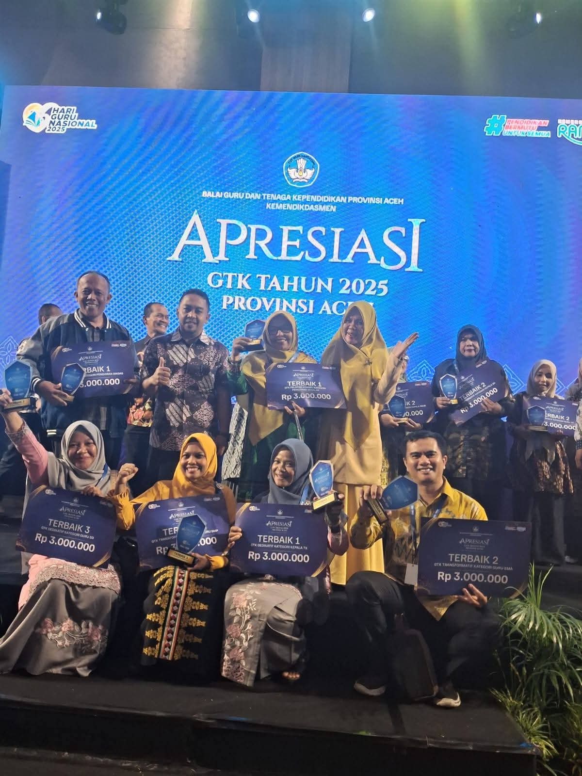 Guru dan Tenaga Kependidikan (GTK) terbaik daerah ini berhasil mengharumkan nama Aceh setelah dinobatkan sebagai juara pertama dalam ajang Apresiasi GTK Provinsi Aceh Tahun 2025 yang diselenggarakan oleh Balai Guru dan Tenaga Kependidikan (BGTK) Kemendikdasmen, Kamis (6/11/2025).